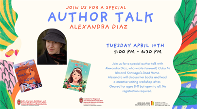 Join us for a special author talk with Alexandra Diaz, who wrote Farewell, Cuba Mi Isla and Santiago’s Road Home. Alexandra will discuss her books and lead a creative writing workshop after.