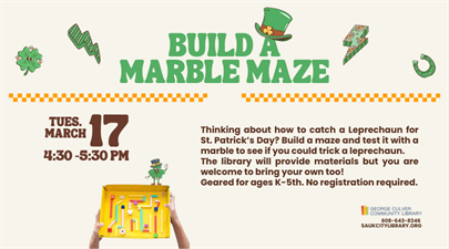 Thinking about how to catch a Leprechaun for St. Patrick’s Day? Build a maze and test it with a marble to see if you could trick a leprechaun. The library will provide materials but you are welcome to bring your own too!