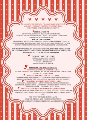 Grab your girlfriends—or come make new ones—and join us for a heart-forward evening of connection, creativity, and a little self-love at Galentine’s Girls Night.