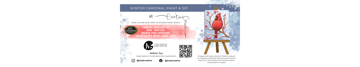 Warm up your winter with a cozy, creative night out at Creative Canvas’ first in-studio paint night, hosted inside Pro Motions Signs & Art. Join us for an evening of guided painting as you create a beautiful winter cardinal masterpiece on canvas.